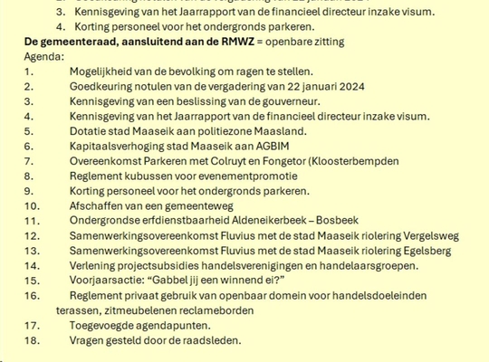 De voorzitter nodigt de raadsleden uit om op maandag 26 februari 2024 om 19.30 uur aanwezig te zijn in het vroegere Minderbroedersklooster (Boomgaardstraat 10) voor deelname aan de volgende vergaderingen: